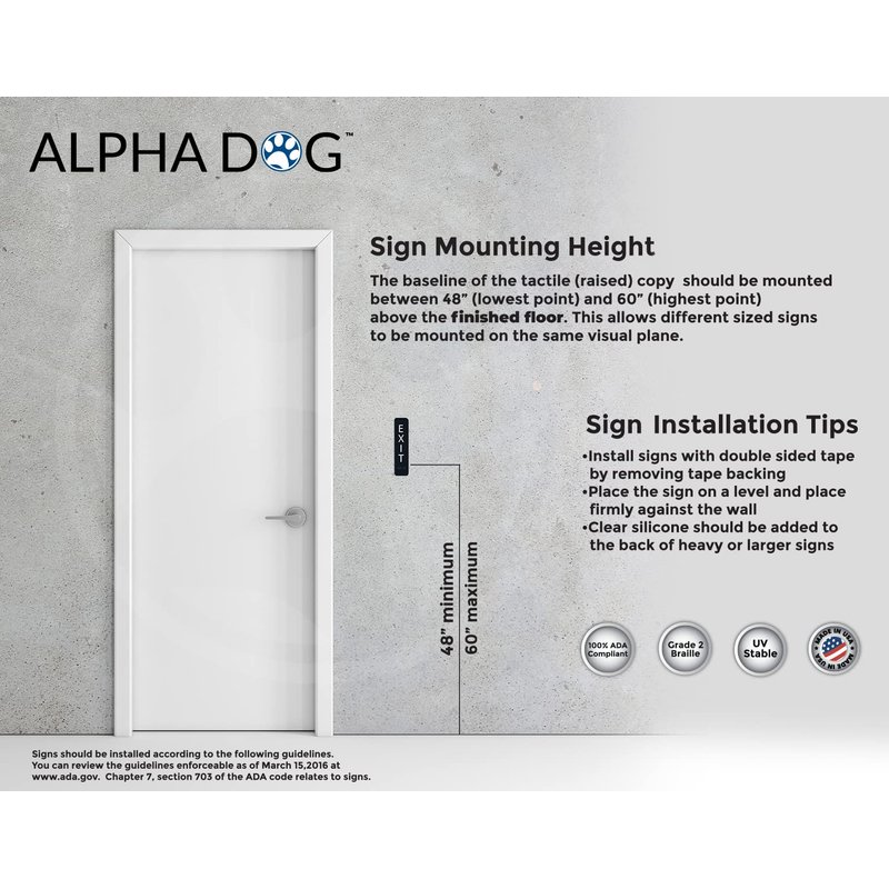 Enhance the accessibility of your office or business with our Braille Exit Signs. Manufactured by ALPHA DOG, these signs are meticulously designed to be 100% ADA compliant, meeting both Federal and California ADA sign requirements. Each sign features Grade 2 'contracted' Braille and 1/32" raised tactile text, ensuring clear and easy readability for visually impaired individuals. Whether you need an 'exit only sign', a 'vertical tactile exit sign', or an 'ada exit sign with braille', our range has got you covered.