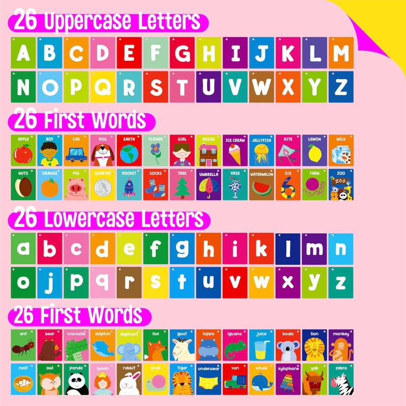 Alphabet Learning: It comes with 52 durable double-sided cards, including 26 uppercase letters and 26 lowercase letters. A good learning tool for kids to master alphabet and basic words.