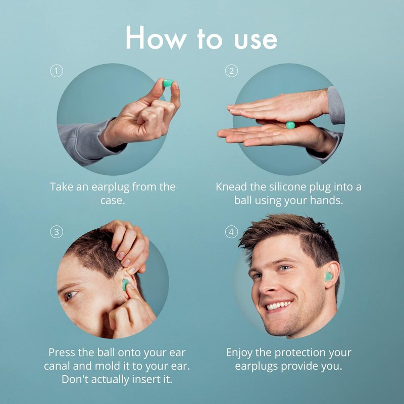 The SoftSilicone is the earplug that fits perfectly and is ideal for all situations. Prepare for the earplugs that care for your ears as much as you do. The SoftSilicones nurture your skin thanks to the use of aloe vera. They are also more hygienic than other products thanks to the use of detoxifying silver. The aloe vera nurtures your skin, while the silver helps to prevent infections. You can rest easy with your silicone ear plugs knowing that they are the most hygienic noise cancelling option. Take your ear plugs with you everywhere you want with them, knowing that your ears will be unaffected by noise and water thanks to it's high quality travel case. The travel case included allows you to separate your used and unused plugs thanks to it's divided insides. This seperation helps add to the hygiene of the silicone earplugs. These, combined with their attenuation of up to 28 dB ensure that your ears are well protected. The SoftSilicone earplugs have been designed for your comfort. The earplugs are the perfect balance of soft and sticky so that you can wear them for long periods of time. These allow for you to easily mold the product to the shape of your ear in a way that keeps them comfortable protected for long periods of time. The air tight seal ensures that your ears are protected from both sound and water, making them perfect for sleeping, swimming, or when you're working in loud environments. The product is suitable for both adults and children, thanks to its moldability. It can fit all ears, making it suitable to be used a s sleeping earplugs for adults who are looking for a snoring solution, or even as swimming ear plugs for kids. You can relax knowing that your ears are well protected no matter where you use them, for as long as you need.