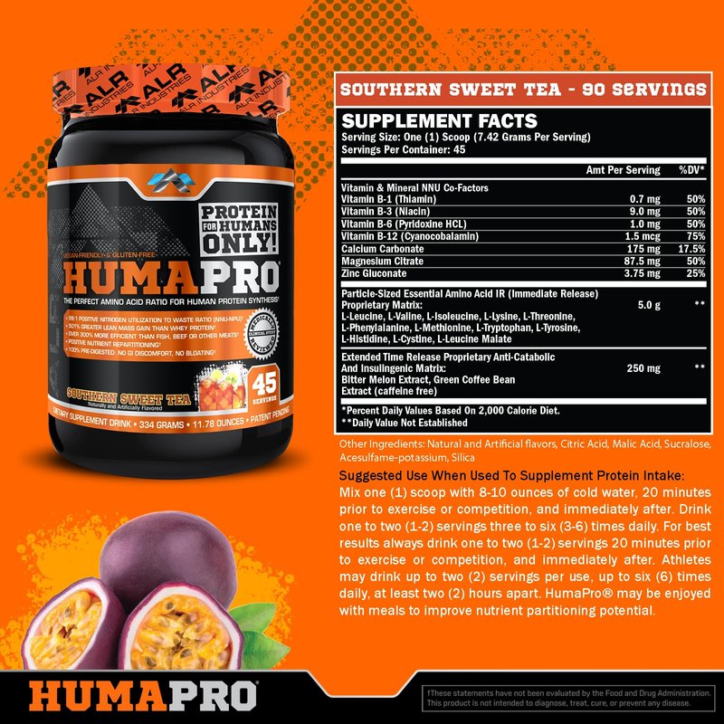 ALR Industries Humapro | Amino Acids Protein Matrix for Humans | 99% Utilization for Lean Muscle | Vegan, Gluten Free | 334g / 45 Servings (Southern Sweet Tea)
