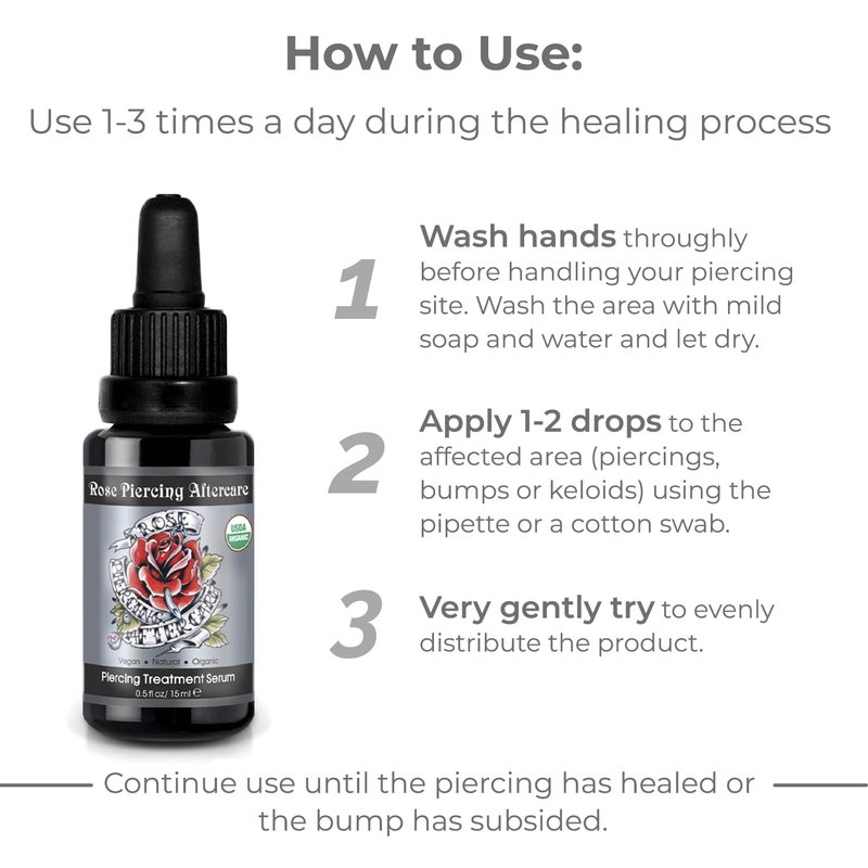 After many months of hard work we have developed a super healing body piercing serum. It's an unique blend of natural botanicals which have been used for thousand of years. After extensive research on the different tribal rituals; careful studying of the properties of different botanicals, and conducting thousands of experiments we have finished our Rose Body Piercing Aftercare.