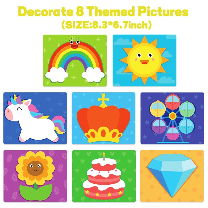 - Easy to Use: Let your child choose one of 8 background cards and they can express their creativity and imagination by creating special patterns on the picture with 7 colors of 3D foam stickers! Foam stickers are soft and thick, easy to peel and paste, no glue, scissors or other tools are needed, and children can easily peel and paste foam stickers on the background card