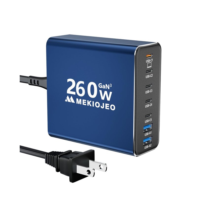 Aluminum Alloy USB C Charger 260W GaN Charger Fast USB C Charging Station 7 Ports 65W Laptop Charger for MacBook Pro/Air/iPad Pro/iPhone (Blue)