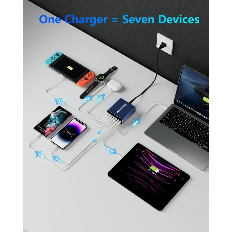 - 7-in-1 USB C Charger: This usb c charger block provides 7 charging wattage options with 5 USB-C ports and 2 USB-A ports. Such a usb c multiport charger can handle all your devices at fast speed with a total output up to 260W. What's cool is that you can charge two laptops with our top two usb c ports of 65w.