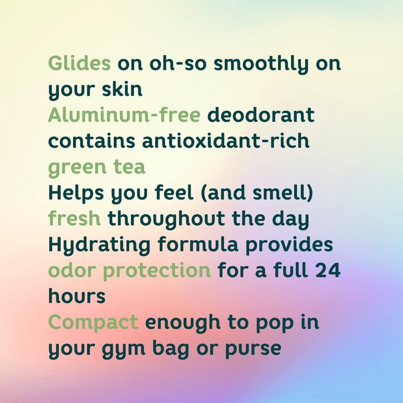 Aluminum free natural deodorant. With Green Tea. Dermatologist tested, baking soda free, oil free, non staining, non sticky. Clean and fresh scent providing protection up to 24 hours