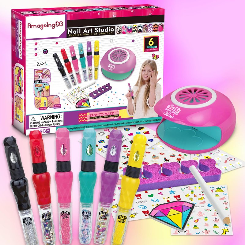 Amagoing Nail Art Studio for Girls, Nail Polish Kit for Kids Age 6-12 Year Old, 3 in 1 Nail Polish Pen, Nail Dryer, Fashion Stickers, Glitter, Decoration Supplies, Makeup Gift for Birthday, Girly Spa