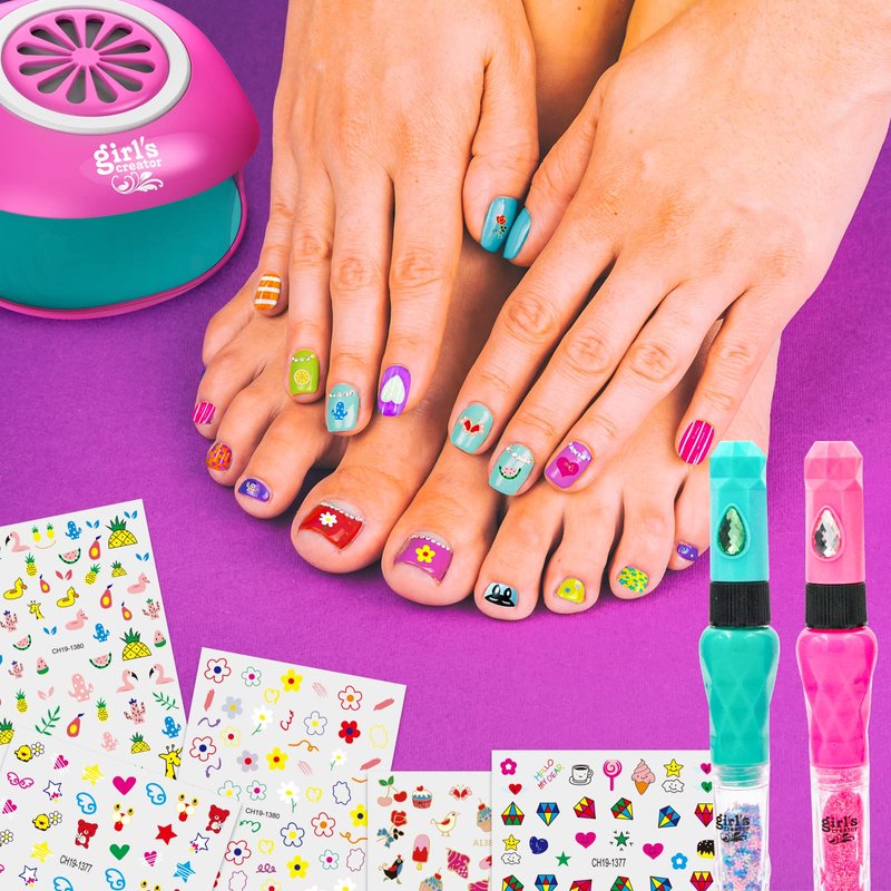 - Perfect Manicure Set For Little Girls Beginner: Rich nail studio tool contain everything you want mani pedi makeover, 6 color bright Nail Polish Pen Combos , Nail Dryer, 200+ Trendy Nail Stickers, variety of colors Gems, Glitter, Nail File, Toe Separators, Easy-to-Follow Instruction Guide.