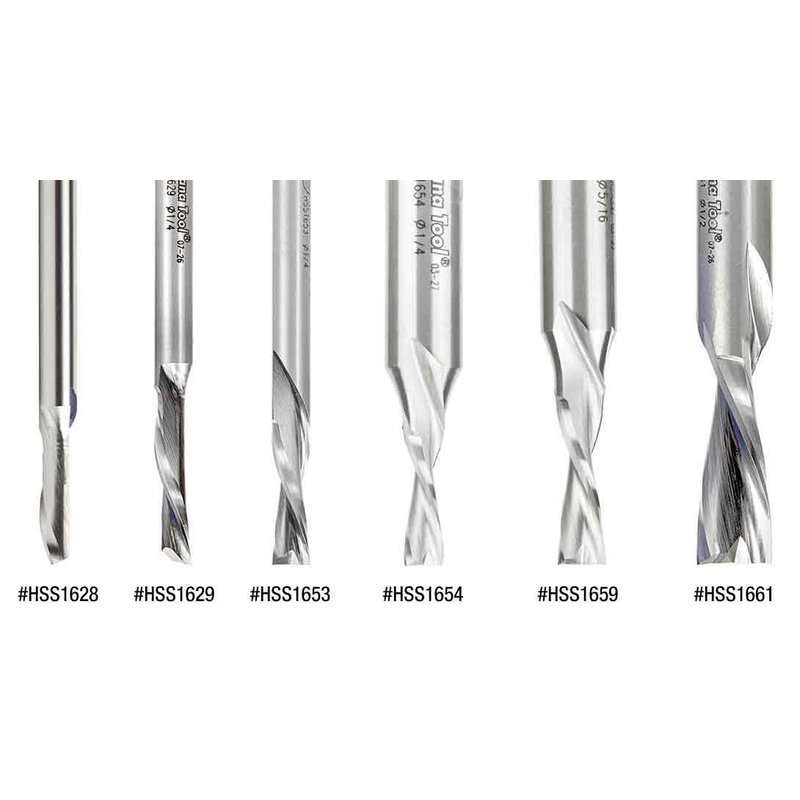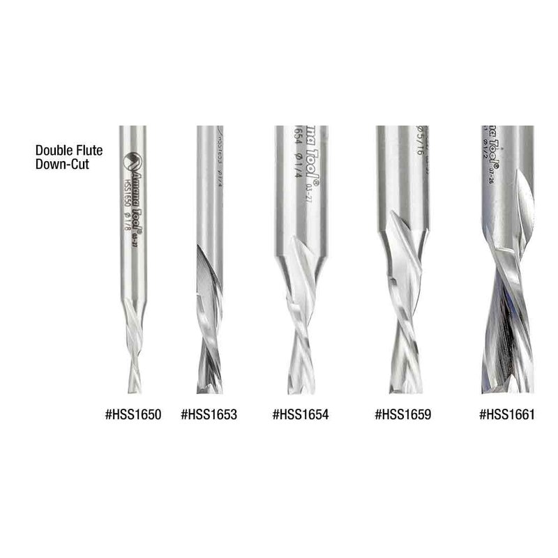 The down cut router bits are recommended when chip removal is directed down to protect the finish of the top of the material that is being cut. The double flute bits provide a smooth finish when grooving and slotting. Use the single flute router bits for routing materials where speed and easy chip removal are desired. Use the aluminum bits for cutting Fomex with Aluminum Face, Sheet and Aluminum Extrusions, Aluminum 5052, and Wood.