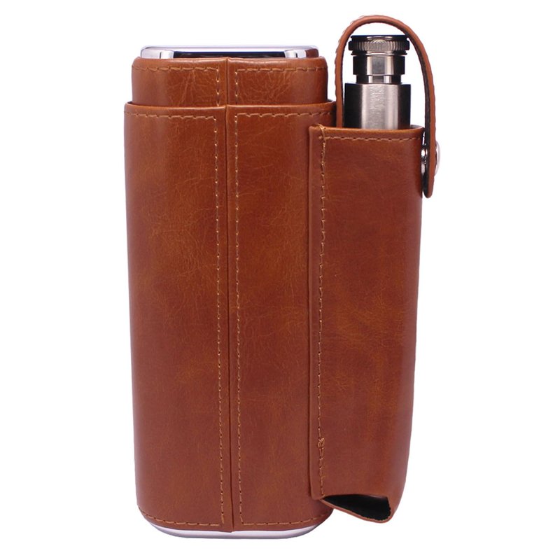 - Classic brown leather lined outside and cedar wood lined inside to keep cigars fresh . The flask is crafted with precision out of 18/8 stainless steel, can holds two ounces of liquor.