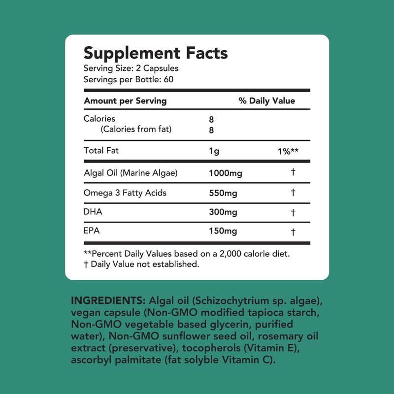 Discover the power of Amandean Vegan Omega-3, a plant-based alternative to fish oil. Sourced from sustainably-cultivated Marine Algae in a pristine and controlled setting. Each 500mg capsule is packed with potent EPA and DHA for your wellness. Support your heart, brain, and eyes with our optimized Omega-3 formula. Ideal for vegetarians and vegans, these softgels blend seamlessly into your diet, offering 300mg DHA and 150mg EPA per serving. Experience joint and cognitive benefits without the fishy aftertaste or fish burps! Great for the mental acuity and eyes for gamers, and supporting heart and brain health for the aging population, not to mention hydrating the skin and joints. Why choose this product? We use only the best ingredients in our formulation. Life's Omega 60 from DSM is the gold standard of algal oils. It's produced in the USA, packaged in a GMP certified facility, and third-party lab tested. We use a tapioca based carrageenan free vegan softgel, as well. Everything is selectively sourced when we create products, and you can expect nothing but the best. Upgrade to Amandean's Vegan Omega-3 and enjoy the difference. Effortless health without harming the ocean. No fish, no fuss, just pure Omega-3 goodness.