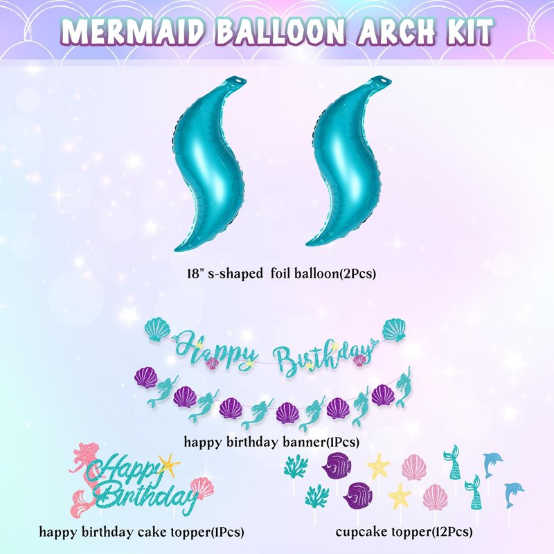 - What We Get: The mermaid party decorations includes HAPPY BIRTHDAY banner, cake topper, 1” S foil balloons, 12 ” 10’’ and 5’’printed balloons/ confetti/ pastel colorful balloons, balloon tools