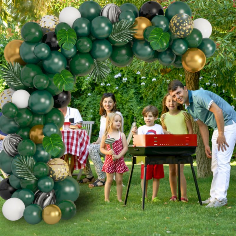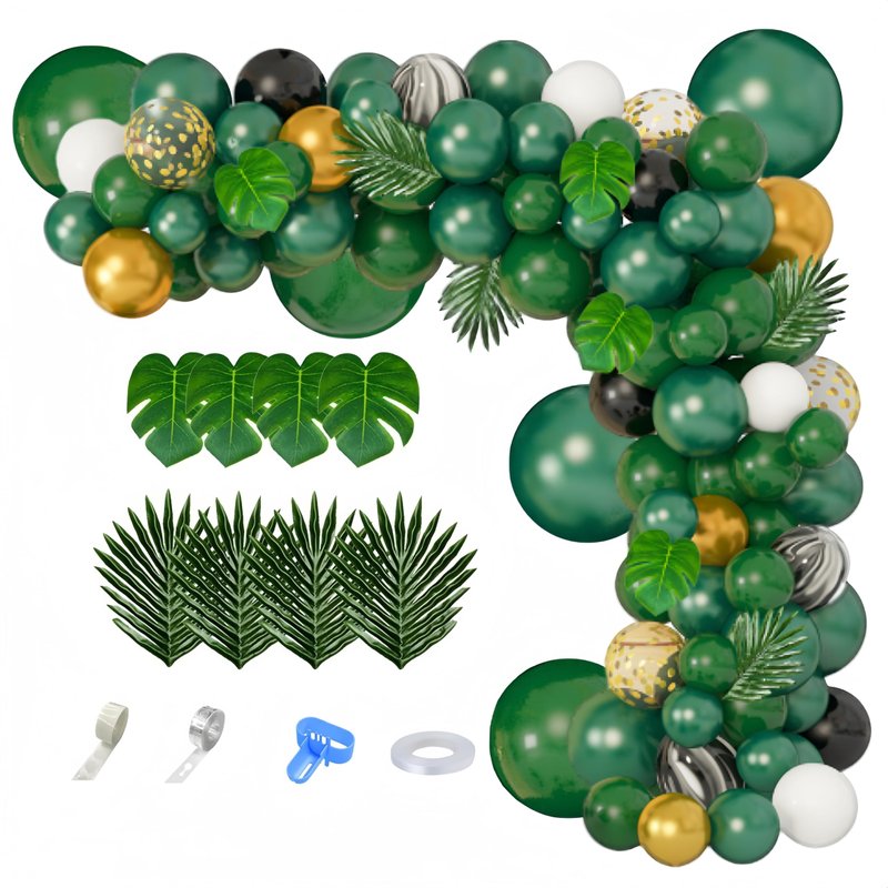 - Package Include: 152 pcs: 12''pearl green/dark green/black white agate pattern/gold confetti balloon(30 Pcs), 10''pearl green/dark green/black/white/metallic gold balloon(55 Pcs), 5''pearl green/dark green balloon(50 Pcs), artificial palm leaves and turtle back leaves(8 Pcs), 4pcs balloon tools(balloon arch strips, tying tool, 100 glue points, random color ribbon); Meet all your jungle theme party supplies ideas