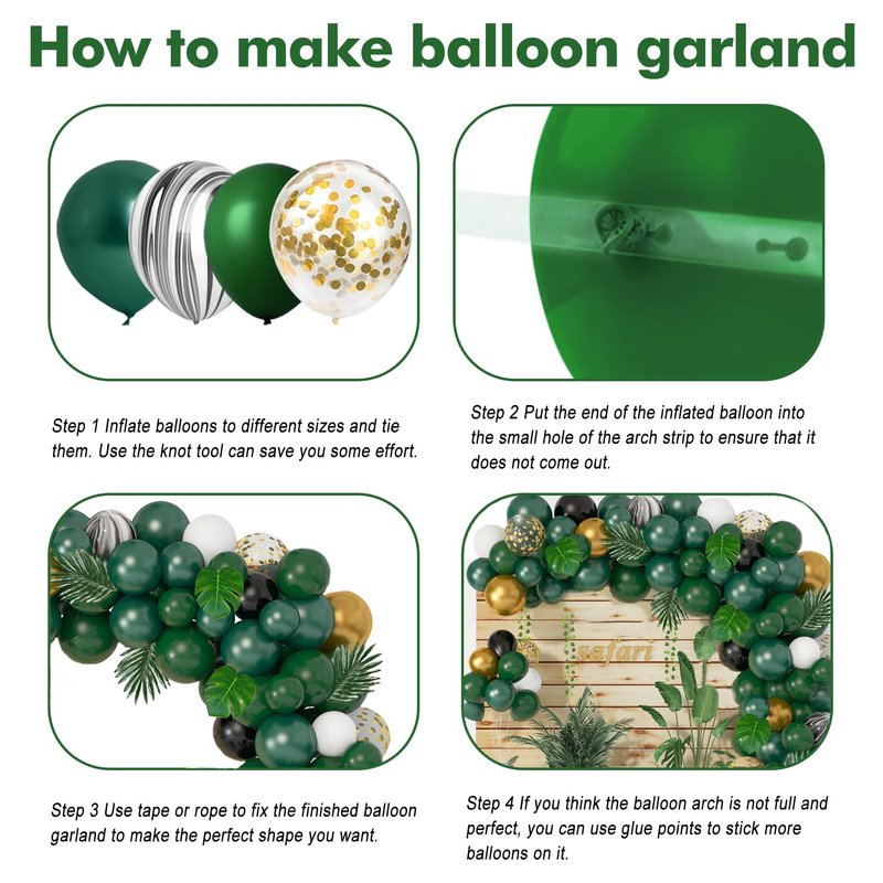 - Easy to Use: Our package also comes with 4 balloon accessories, including balloon arch strip, balloon glue points, tying tool and ribbon; These tools can help you build a gorgeous safari balloons arch to enrich your jungle theme party supplies; Different sizes and color help the green balloon garland arch look fuller and more organic