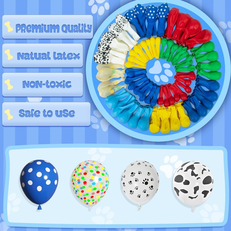 - 155Pcs Paw Balloon Birthday Decorations- 18''dark blue/light blue/yellow/red balloon(4pcs), 12''dog paws print/spotted balloon(10pcs), 12''dark blue white/red/red blue yellow green confetti balloon(30pcs),10''dark blue/light blue/yellow/green balloon(55pcs),5''dark blue/yellow/red/green balloon(45pcs), white long balloon(5pcs), 4pcs balloon tools(balloon arch strip, tying tool, glue points, ribbon). This is a wonderful dog theme birthday party decoration!