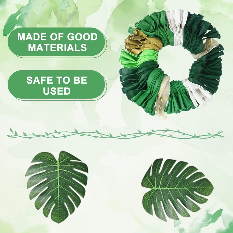 - Package Includes: 18" drak green/green/gold metallic balloons(3 Pcs), 12'' gold confetti balloons(5 Pcs), 5'' gold confetti balloons(5 Pcs), 12'' dark green/green balloons(20 Pcs), 10'' gold metallic balloons(10 Pcs), 10'' drak green/green/fruit green/white latex balloons(50 Pcs), 5'' drak green/green/white latex balloons(60 Pcs), 6pcs artificial palm leaves, 1 pcs tying tool, 1 pcs silver ribbon, 1 pcs 100 glue points and 1 pcs balloon arch strip; Meet all your jungle theme party supplies ideas