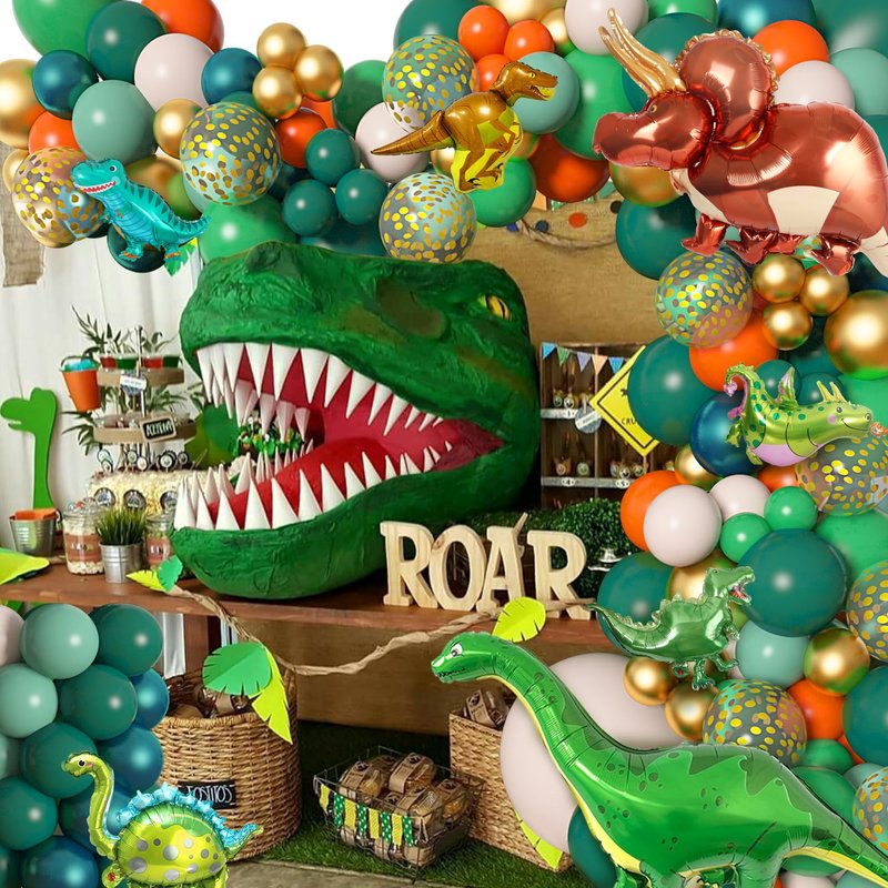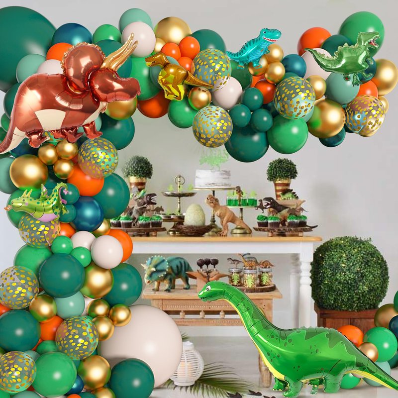 - Dinosaur Balloon Garland Kit - 167pcs: small dinosaur print balloon(6pcs), big tyrannosaurus balloon(2pcs), 18''dark green/nude balloon(2pcs), 12''dark green/green/gold confetti balloon(30Pcs), 10''orange/sage green/nude/peacock blue/metallic gold balloon(50Pcs), 5''dark green/green/orange/metallic gold balloon(60Pcs), 16'' gold happy birthday foil balloon(13 letters), 4pcs balloon tool(balloon arch strips,tying tool,100 glue points, ribbon), meet all your dinosaur birthday decorations needs.