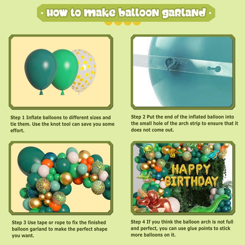 - Easy To Assemble - Our dinosaur theme party supplies also comes with 4 balloon accessories, including balloon arch strip, glue points, tying tool and ribbon. It is very easy to make a beautiful dinosaur balloon garland arch with these tools. It only takes about 30 minutes. These tools can help you build a perfect dinosaur balloon garland to enrich your jungle theme party supplies. Different sizes and color help the dinosaur green balloon garland arch looks fuller and more organic!