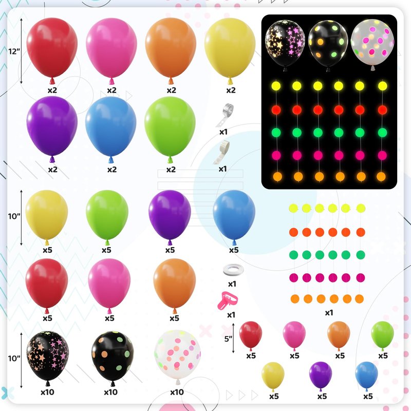 - Easy to Use: Our glow in the dark party supplies comes with balloon accessories which can help you create the great rainbow balloon arch kit; You can inflate the balloons with air or helium, hanging them together using the balloon strips, stick the balloons to the balloon arch with glue points; Our neon garland is already strung, saving you time and effort; You can enjoy the DIY process with friends and family