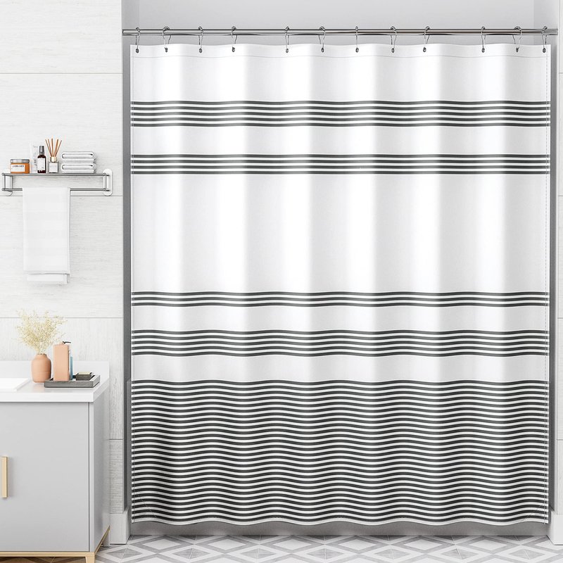 Our textured polyester shower curtain contains 12 reinforced metal grommet holes and 12 durable metal nickel brushed shower curtain hooks. The generous 72 inch size is sure to fit most bathtubs and shower stalls and easy to install.