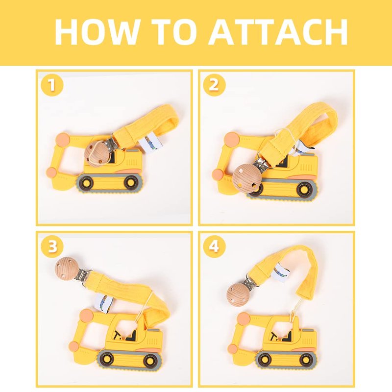AmazingM Baby Food Grade Silicone Car Teether Toy with Pacifier clip Holder,Teething Pain Relief Toys Gift Set for 3 Months+ Boys and Girls,Freezer Safe,BPA Free (Excavator, Yellow)