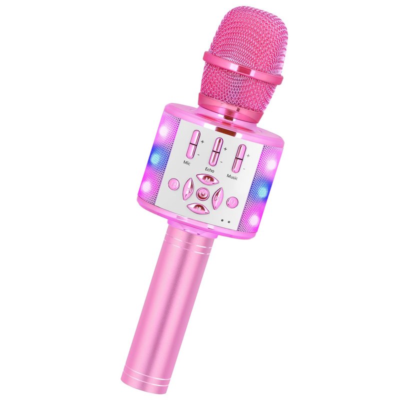 SHOW YOURSELF & HAVE MORE FUN Amazmic Wireless Karaoke Microphone toy for kids Can Do Lots Of Things For You~As a microphone toy to showcase your talent (singing or humorous MC), cultivate kids’ talent and courage in a relaxed environment from a young age; As a home karaoke machine, so you can sing happily at home anytime; As a Bluetooth stereo to play music; Magic sound function, fun, switch different sounds to make singing more fun. ►Ergonomic Design:Ergonomic design and comfort grip handles, own incredible comfort and seamless sound that sits effortlessly in your ears. ►Bluetooth Connection & Cable Connection:The wireless karaoke microphone toy for girls can connect with all Bluetooth devices including Android, iOS smart-phones, PC, laptops and almost all singing APP. Also you can contact microphone via cable. ►Magic LED lights:Built-in LED lights(Red, Blue, Purple), flash with music and your singing. A great gift choice for kids, birthday party, holiday, Christmas. ►Recording Songs:Connect it to your cellphone via Bluetooth, you can sing and record every single word. Professionally tuned microphone, make your songs hear more beautiful. ►Superior Loud Speakers:5W loudspeakers, less harmonic distortion. It produces a more stunning KTV live-sound and more clear music rhythm with echo reverberation. ►Remarkable Sound Quality: Advanced 3-layers noise-deduction reduce noise to smallest, give you incredible using experience. Fluent and loud enough speaker, echo effect also give you a feeling of a live concert. Specifications:Speaker power: 5wProduct weight: 0.7lb Maximum sound pressure level: >115dB 1KHz THD<1%Package include:Amazmic Wireless Karaoke Microphone *1Charging cable *1 User Manual *1