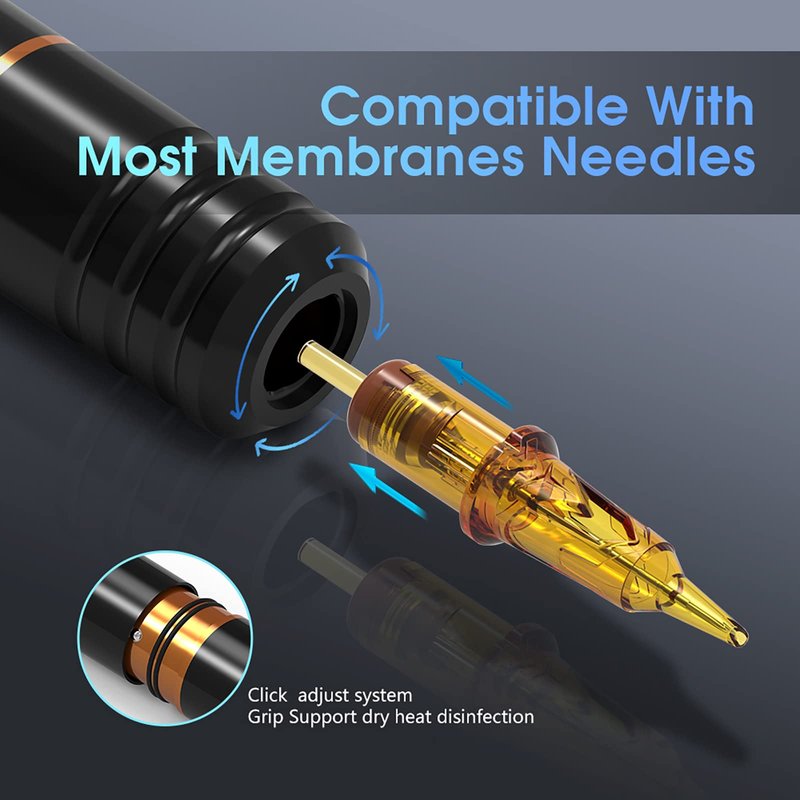 - Ambition cartridges tattoo needle are made of 316 medical stainless steel. Each needle is screened and tested strictly, come with safety membrane to prevent ink leakage to the tube or machine. Ambition tattoo pen built-in custom coreless motor, 10V - 9000RPM.The stroke length of our pen machine is 3.5mm. Perfect for packing colour and shading, performs well for both lining and shading. This tattoo pen machine advanced gear system that make sure reliable, quiet operation and less vibration.