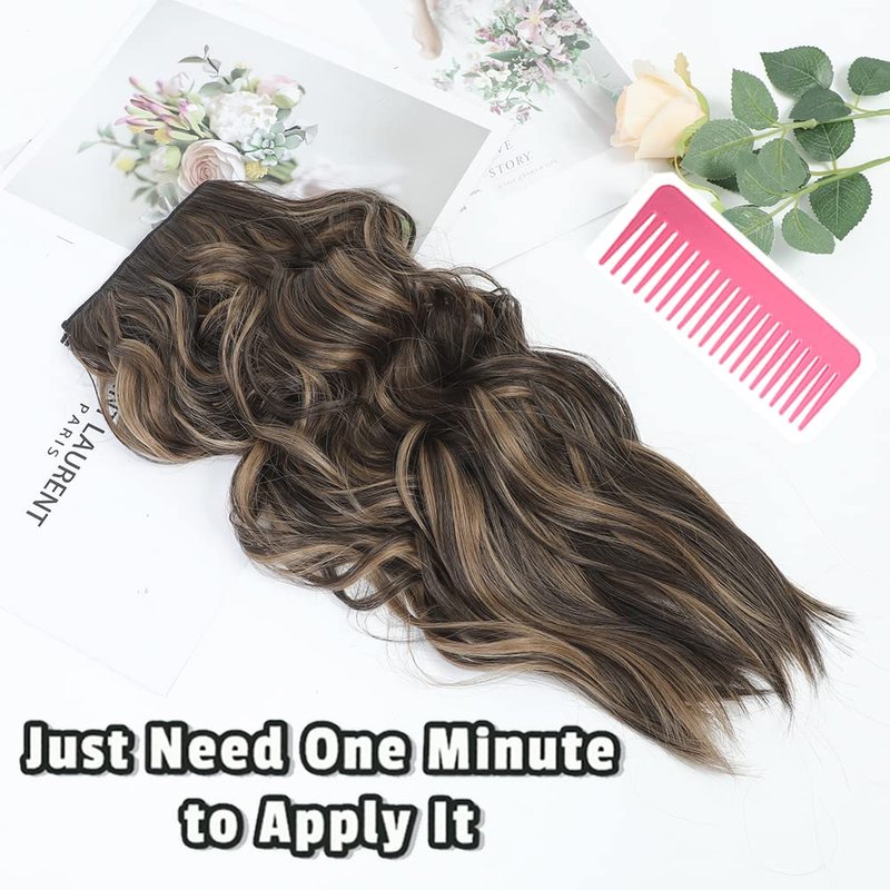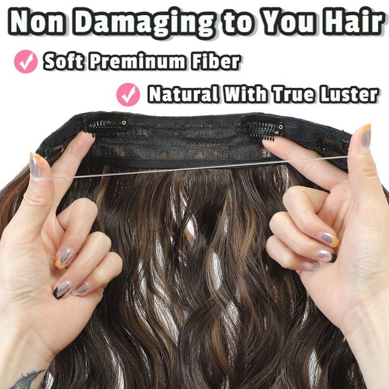 Amchoice Halo Hair Extensions 20 Inch Invisible Wire Secret Hairpieces with Adjustable Size Transparent Headband 4 Secure Clips Long Curly Wavy Hair Extensions(20 Inch, Brown with Highlighters)