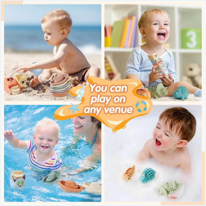 - Fun Bath Toy Set - The baby bath toys toys set inlcude 3 pcs different silicone animal shapes bath toys with 6pc bath boats and 5pcs lovely suction cup bath toys , Unique and Colorful design helps baby to recognize the color and improve their hand-eye coordination and imaginative! These toddler bath toys could float good and are easy to grab, ideal for infants 6-12 months and toddlers 1-3 years of age.