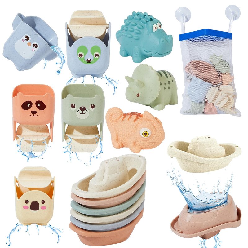 Fun Bath Toy Set - The Water Bath Tub Toys set inlcude 3 pcs different silicone animal shapes bath toys with 6pc Floating Boat and 5pcs whirling waterfall Cups , Unique and Colorful design helps baby to recognize the color and improve their hand-eye coordination and imaginative! These toddler bath toys could float good and are easy to grab, ideal for infants 6-12 months and toddlers 1-3 years of age. waterfall fun! - unique bath toys, powered by water, for bath time fun! 1 cup for scooping and pouring over the toys, 4 distinct Cups adhere to the bathtub wall using suction cups and pour water over the cups to see the wheel spin. Your little one won’t be able to get enough, and this toy is excellent at developing both motor skills and hand-eye coordination. Easy to Clean and Organizer- Made of safe materials.Fine fabrication without edges and corners.Toddlers can play at ease.they're single piece construction and easy to clean. Comes with a drying Mesh Bag, making it easy to keep your toys organized and ready for the next bath time. Have Fun and Learning:Stack, scoop, strain, spill, pour & more - AMCHSURI Bath Toy will keep curious minds occupied & entertained all bath long. present for Boys and Girls:Popular bathtub/ocean/swimming pool toy for 6 months-3 years old toddlers.No child will refuse water toys.Good present for Christmas Day/Birthday/Children's day/kids party