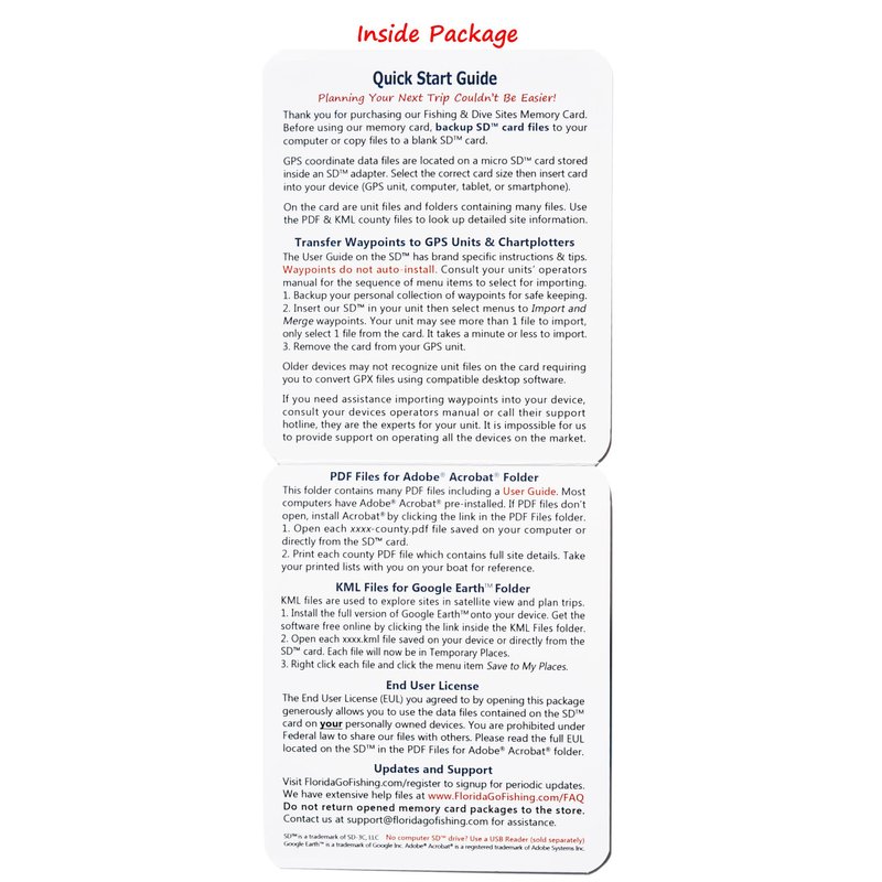 You need compatible software (not included) installed on your devices. Files on this card contain waypoint locations only - maps and nautical charts underlay waypoints when viewing on your software.
