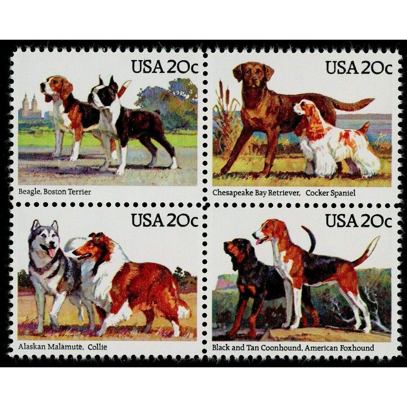 This block of four stamps was issued to commemorate the 100th anniversary of the American Kennel Club. Designed by Roy Anderson, each stamp illustrates some of America's most popular dog breeds.