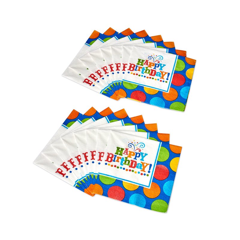 - Napkins feature a colorful and festive polka dot and striped border with happy birthday lettering