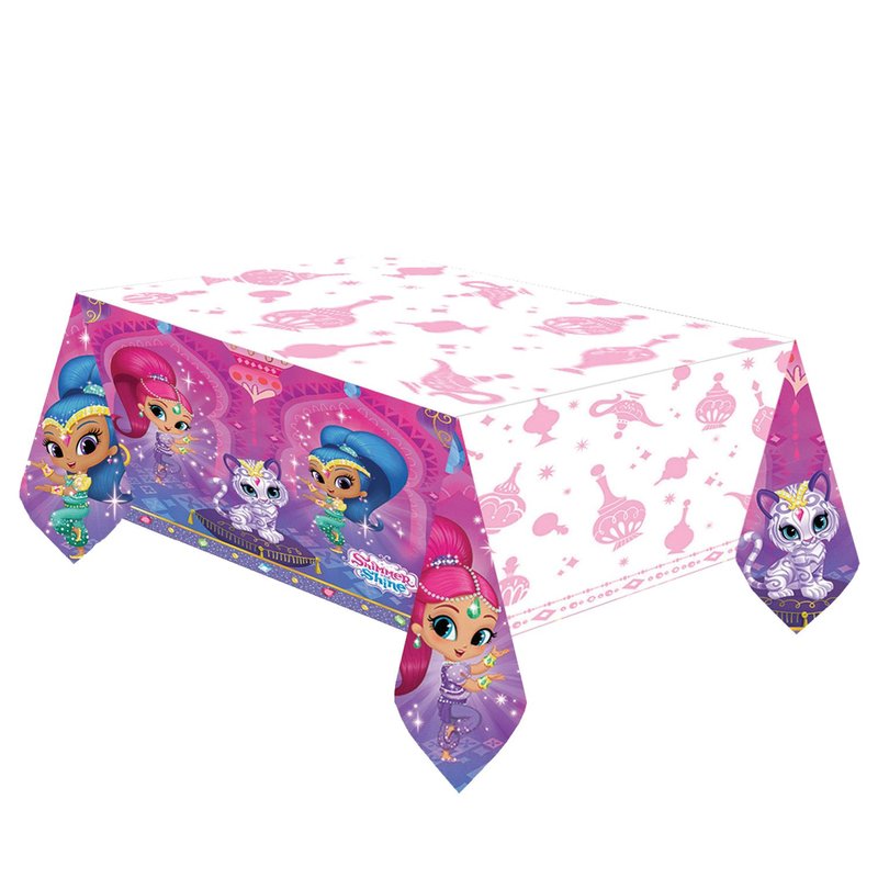 - Shimmer and Shine table cover features the genies-in-training posing with pets Nahal and Tala