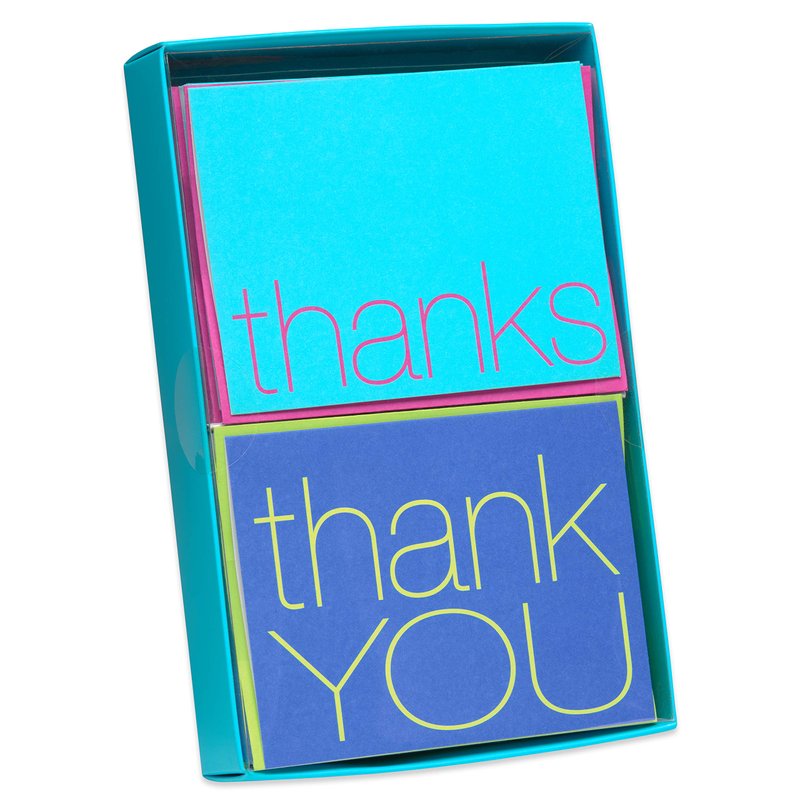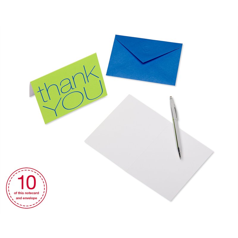 - This bulk stationery set of 50 thank-you cards features brightly printed letters in lime green, blue, magenta, teal and orange color combinations