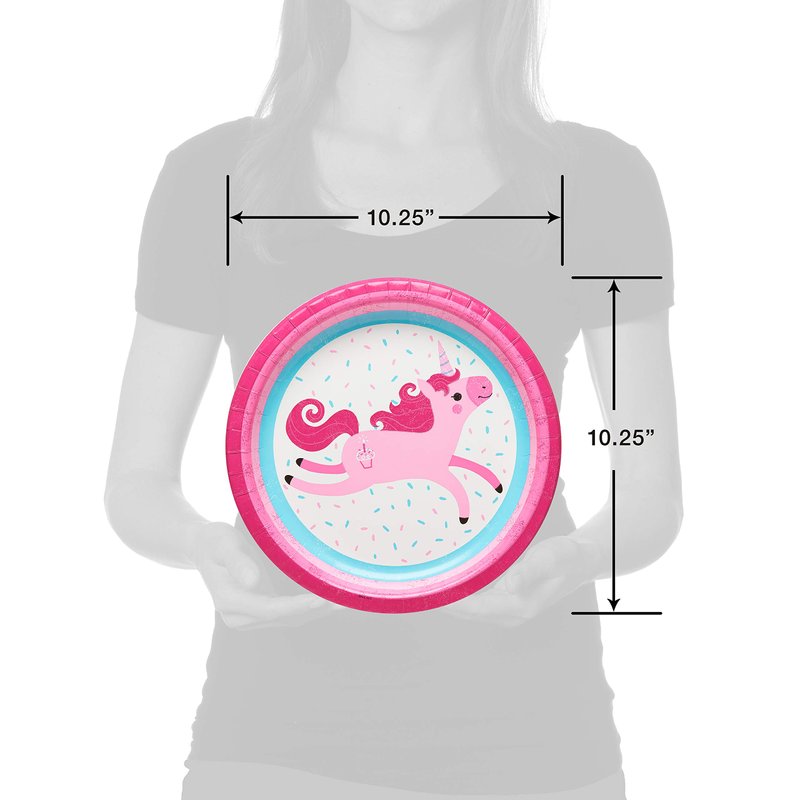 - Festive dinner plates feature a birthday unicorn character and a colorful print with pink and aqua sprinkles and stripes.
