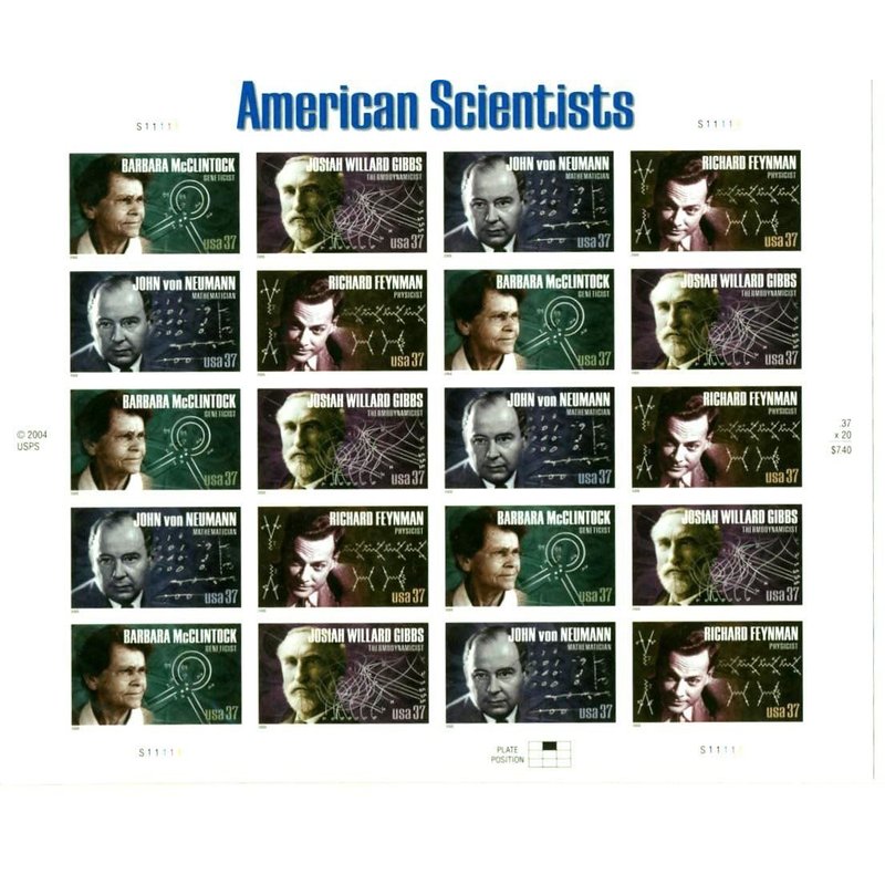 American Scientists (Barbara McClintock, Josiah Willard Gibbs, John von Neumann, Richard Feynman), Full Sheet of 20 x 37-Cent Postage Stamps, USA 2005, Scott 3906-09