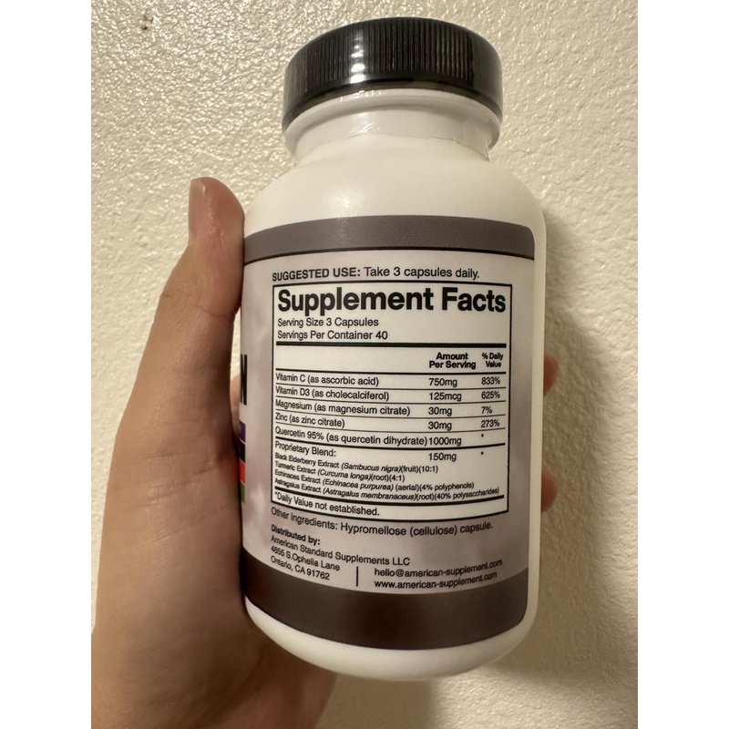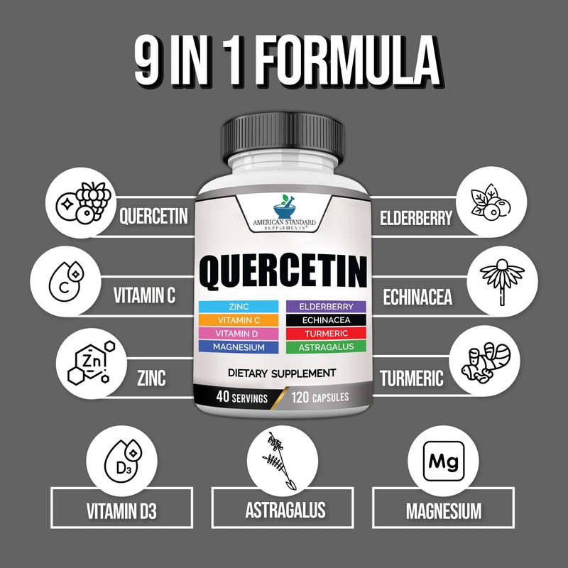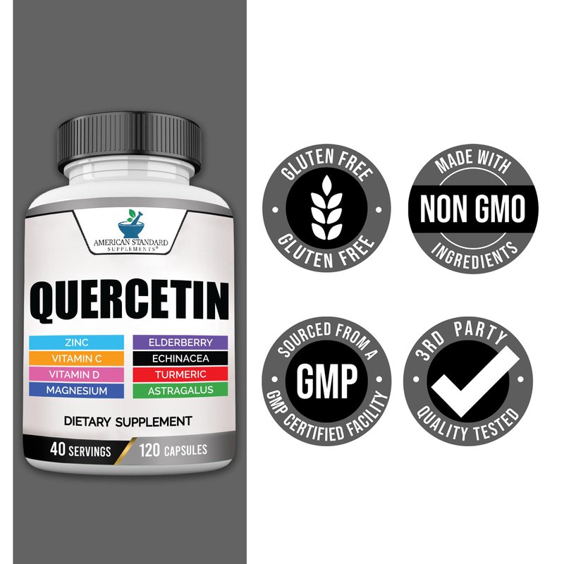 American Standard Supplements Quercetin 1000mg Per Serving with Zinc, Vitamin C, Vitamin D3, Magnesium, Elderberry, Echinacea, Turmeric, Astragalus - Gluten Free, Non-GMO, 120 Capsules, 40 Servings