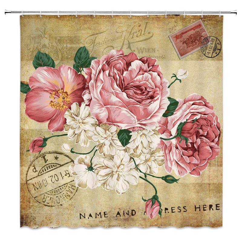AMFD Retro Flower Shower Curtain Pink Rose Vintage Old Look Plant Envelope Art Bathroom Curtains Polyester Fabric Waterproof 70 X 70 Inches Include Hooks Tan Brown