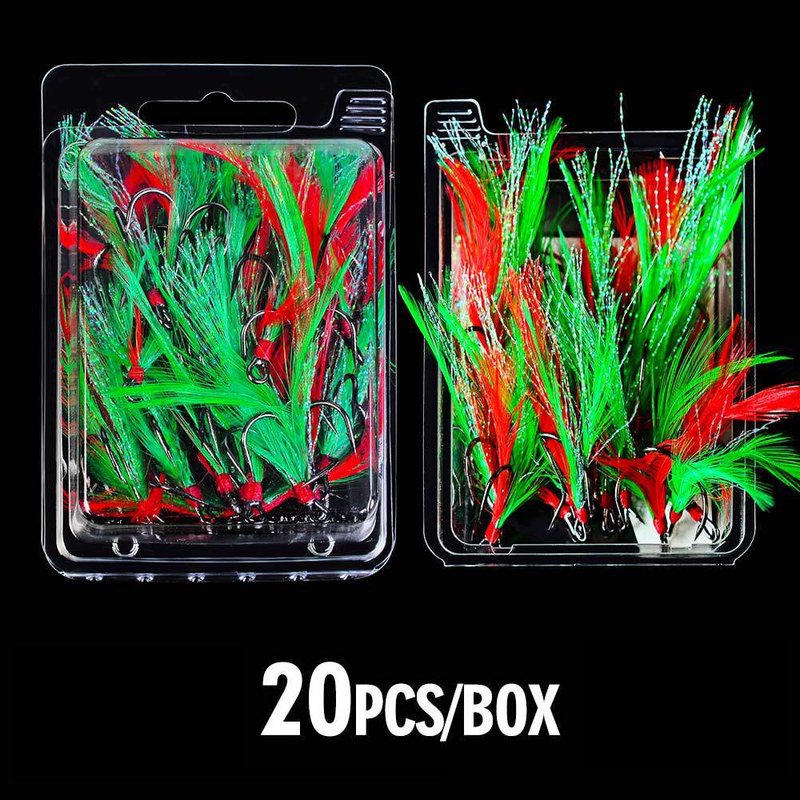 AMHDV Feather Fishing Hooks Strong Treble Hooks Size 2 4 6 8 10 (Pack of 20) (Red and green, 8#)