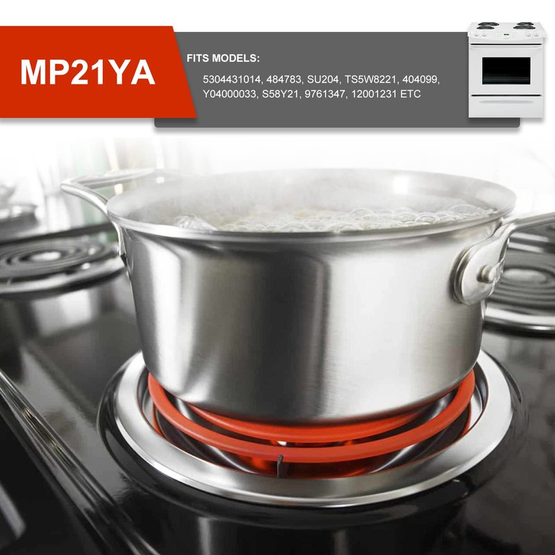 - Range Burner part number MP21YA.It is a large 8" burner 2100 watt 230v 5 turns.The turns are how many times the coil goes around in a circle.It has a "Y" style bracket.This burner fit most ranges. If the range burner does not sit flat on your stove, make sure the connection bolts are parallel and pushed a bit down