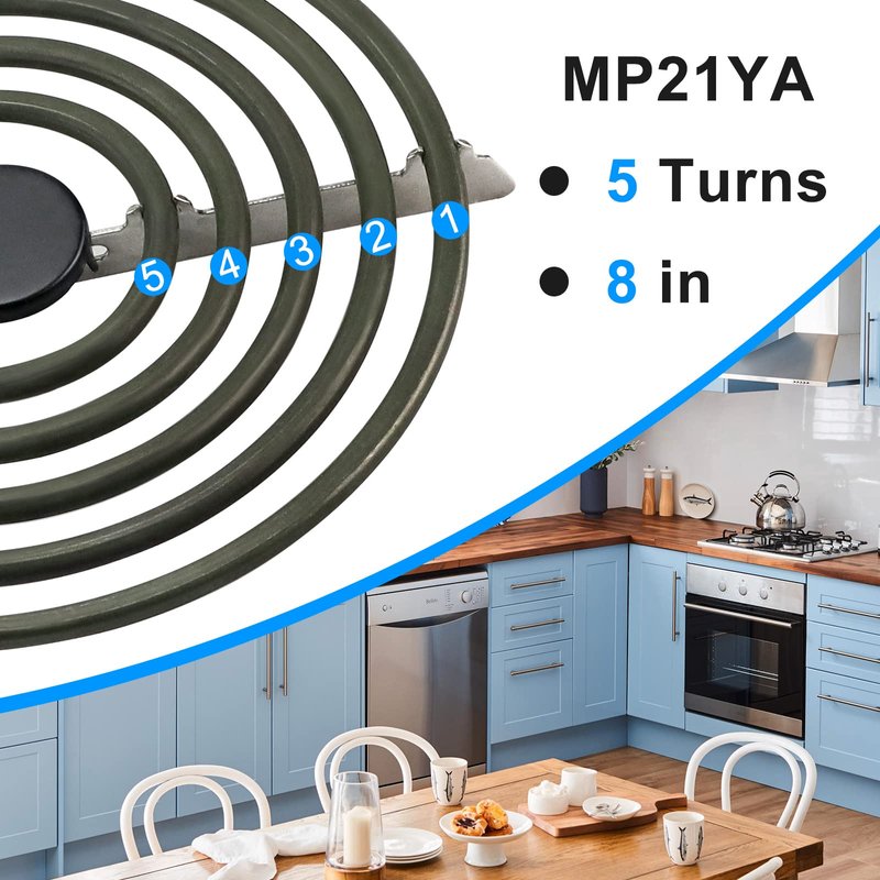 - PARTS NUMBER: Stove Burner MP21YA Electric Range Surface Burner Coil 8",2100W 230V 5 turns. The turns are how many times the coil goes around in a circle.It has a "Y" style bracket.This burner fit most ranges