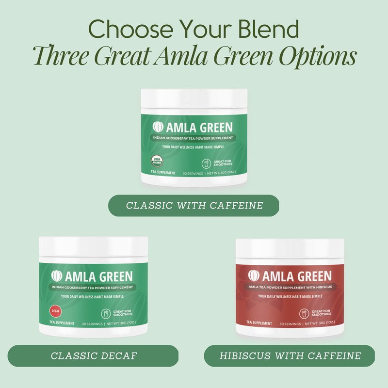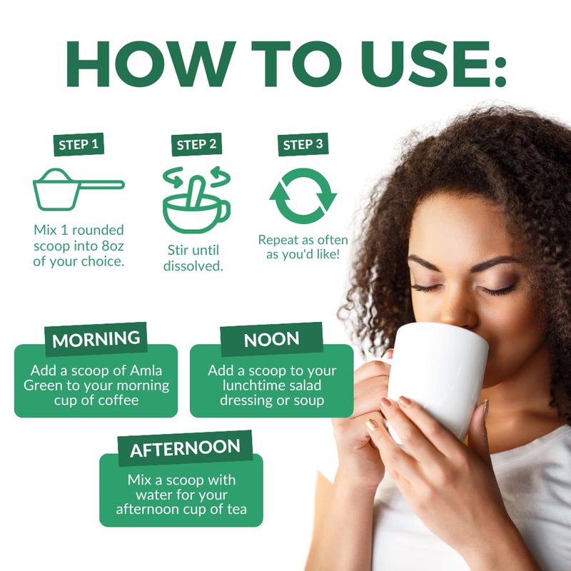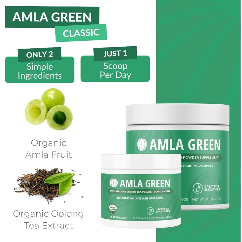 - DAILY SUPER GREEN TEA: With over 10,000 daily active users, Amla Green is the go-to source for antioxidative benefits mixed into smoothies, breakfast bowls, or as a hot or cold morning or evening tea. One scoop per day provides a natural method for supporting your most critical areas of health, with a smoother taste and better flavor than traditional amla supplements.