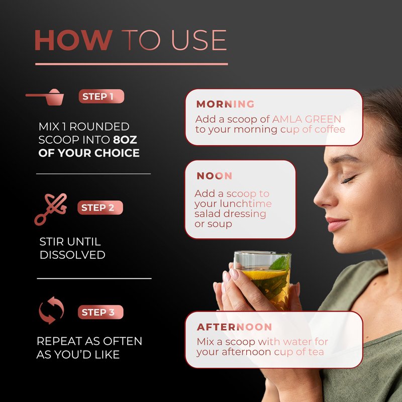 - DAILY SUPERFOOD TEA: With over 10,000 daily active users, Amla Green is the go-to source for antioxidative benefits mixed into smoothies, breakfast bowls, or as a hot or cold morning or evening tea. One scoop per day provides a natural method for supporting your most critical areas of health, with a smoother taste and better flavor than traditional amla supplements.