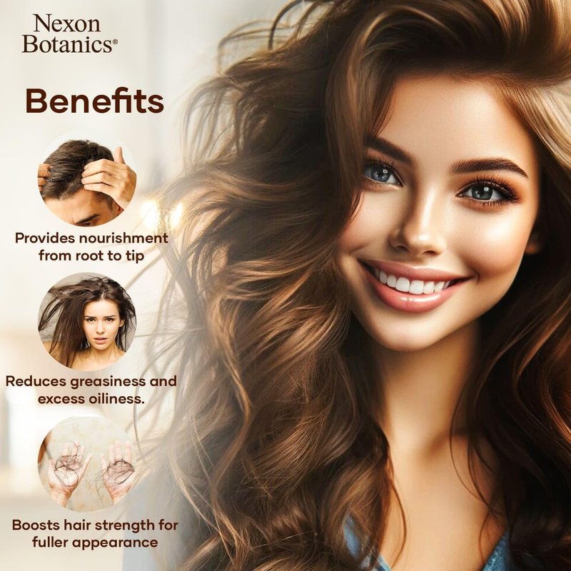 Our Premium Nourishing Hair Oil is crafted with a potent blend of natural oils including almond, amla, argan, and castor. This luxurious and lightweight hair oil is designed to replenish and revitalize your locks from root to tip. Infused with oils having a rich array of vitamins and antioxidants, our natural hair oil penetrates deeply into the hair shaft, delivering intense hydration and essential nutrients to promote optimal hair health. This hair oil treatment absorbs quickly without leaving behind any greasy residue, making it suitable for all hair types. With continued use, experience hair that's not only more manageable and resilient but also visibly thicker, fuller, and more vibrant. Nexon Botanics Nourishing Hair Oil improves the appearance and texture of your hair. It also provides a multitude of benefits for your scalp. Use our hydrating hair oil to soothe scalp irritations, dryness, and itchiness for improved hair vitality. We ensure that our dry hair oil is formulated without harsh chemicals like sulfates and parabens, and it is gentle enough for daily use. Whether you use it as a leave-in treatment, overnight mask, or as a finishing touch to your styling routine, our Nourishing Hair Oil is your ticket to hair that looks and feels its absolute best, every day.