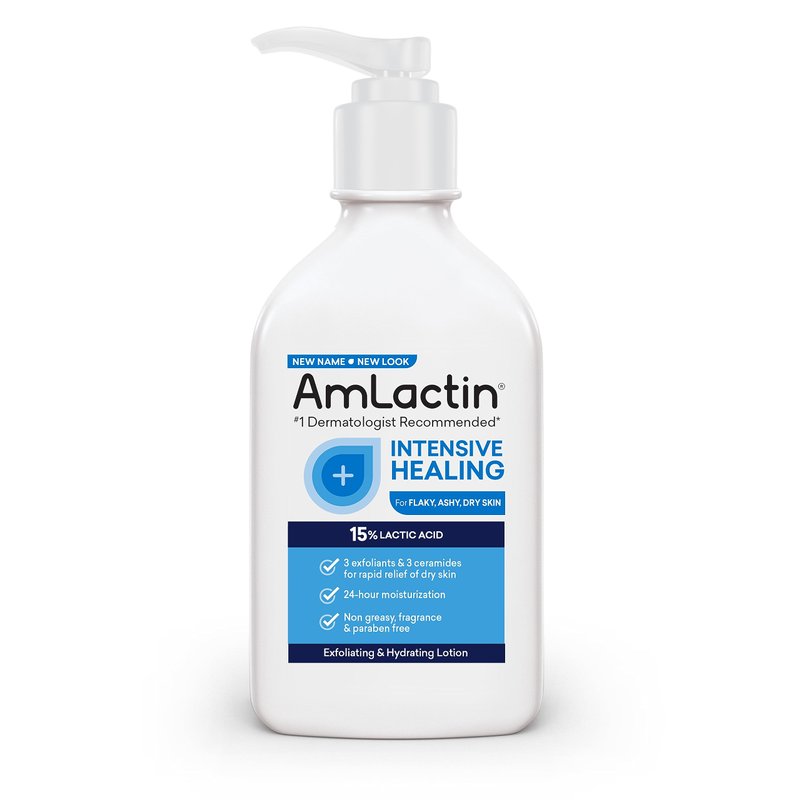 AmLactin Intensive Healing Body Lotion for Dry Skin – 7.9 oz Pump Bottle – 2-in-1 Exfoliator and Moisturizer with Ceramides and 15% Lactic Acid for 24-Hour Relief from Dry Skin (Packaging May Vary)