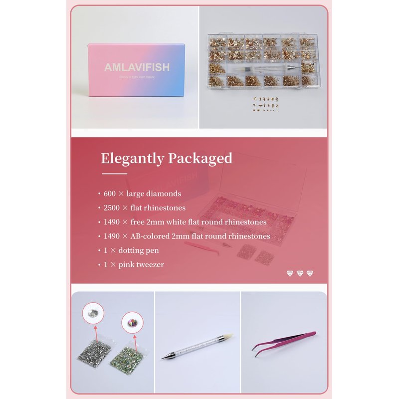 Our versatile collection includes 600 large diamonds, 2500 flat rhinestones, 1490 free 2mm white flat round rhinestones, and 1490 AB-colored 2mm flat round rhinestones. Mix and match these stunning gems to create custom designs that reflect your unique style. Included in the package are dotting pens and pink tweezers, providing you with the necessary tools to create your nail art masterpieces.