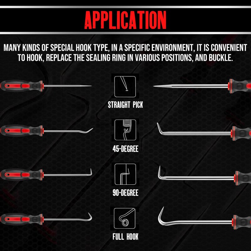 - Pick set Includes 90 Degree Hook, 90 Dagree Hook, Large Full Hook, Straight Pick, Small Full Hook, Combination Pick, Offset Pick, Hose Pick, Cotter Pick, double angle pick