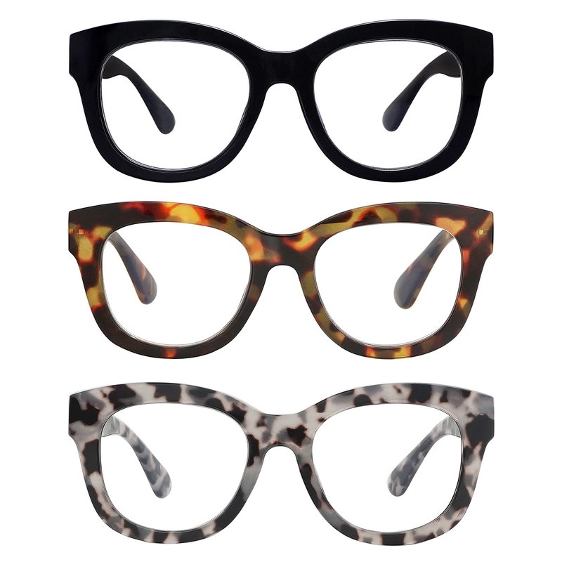AMOMOMA 3 Pack Retro Oversized Reading Glasses for Women Blue Light Blocking Computer Readers Spring hinge AM6003 with Black+Brown+Grey Tortoise Frame 1.50 x