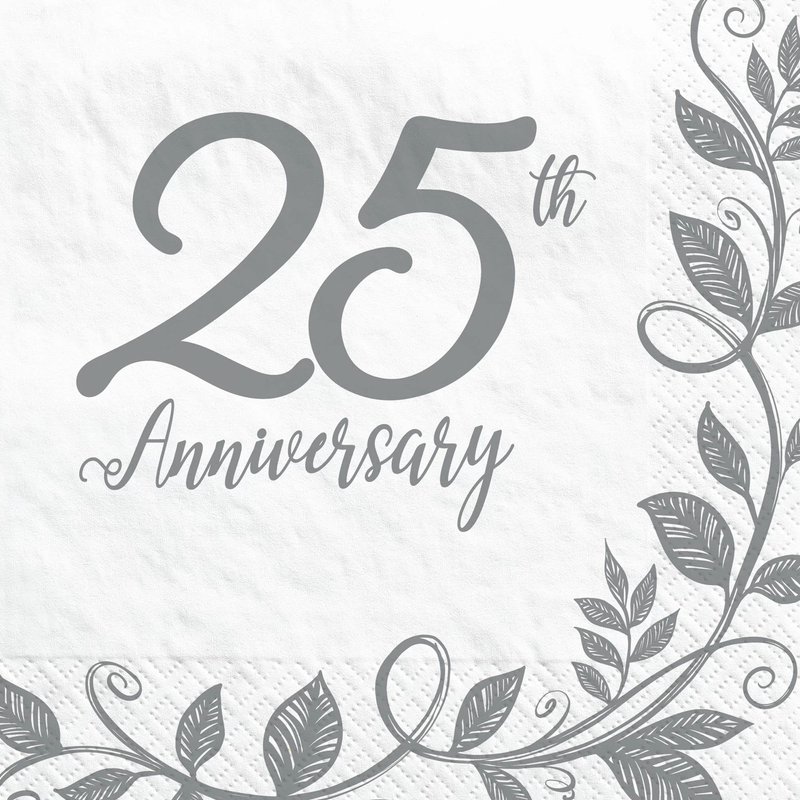 - In 25th Anniversaryin lunch napkins with silver and gray floral design