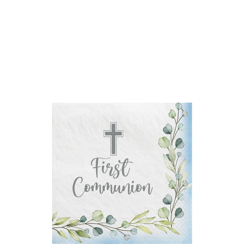 - CELEBRATE IN STYLE: Add a touch of elegance to your child's First Holy Communion celebration with our beautifully designed My First Communion Beverage Napkins, featuring a delicate cursive print, cross, and vines of leaves on a lovely blue border.